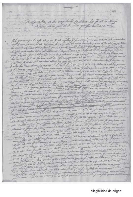 Al principal capítulo de que los padres de aquellas partes se ocupan más en tratos de mercadería que en conversión de almas, se responde no haber tal cosa, como consta del progreso de la Compañía desde que fue a Japón, probado auténticamente con testigos portugueses y japoneses fidedignos y tomadas todas delante del capitán mayor Roque de Melo,[29] el cual proceso fue pasado por cancelería, y lo puede vuestra majestad mandar ver, consta también por las cartas del Virrey y otras personas graves de la India, la cual información y cartas se procuraron traer de allá, por entender los muchos émulos que tenemos, que ellos por ventura se moverán con buen fin, mas no fue bastante la diligencia que hicimos, porque hallamos acá más capítulos[30] de los que imaginábamos, más darse ha a vuestra majestad de todo información auténtica. Ni se ha de creer que enviando, como envía el padre General de Europa a aquellas partes de los más ejemplares religiosos que tiene, y [borra] todos con vocación de hacer vida aptica [la copia pone 'apostólica'], privándose para eso de todas las humanas comodidades que acá hay, y entregándose a tan inmensos peligros, y haciendo vida tan áspera, particularmente los que viven en Japón por ganar aquellas almas, nunca jamás durmiendo en cama, ni bebiendo vino, sino siempre agua caliente, y raras veces comiendo carne, viviendo en casas muy pobres, con otras muchas asperezas a todos los que allá van notorias, que tan fácilmente se muden, y se hagan mercaderes, cuanto y más que cuando se hicieran mercaderes por no desamparar aquellas empresas de almas tan importantes. Viviendo ellos como viven vida tan ejemplar y perfecta como sabe todo el mundo, y vuestra majestad se puede informar [borra la frase: que me ofrezco a dar a cuenta a nuestro Señor en el día del juicio que en toda la Iglesia de Dios no vi comunidad de mayor perfección], antes hubiesen de ser motivo de edificación que de escándalo, más ni eso no hay. El motivo principal que tuvieron nuestro émulos es que viendo la Compañía que todas las limosnas que vuestra majestad y su santidad daban a Japón, aunque eran muy buenas, no eran bastantes para sustentar tanta máquina de colegios y seminarios y iglesias de Japón,[31] y que el dinero que de acá iba si pasaba en dinero de Japón se perdía mucho, y la ciudad de Miyako se ofreció a enviar este dinero a Japón cada año en seda y oro sin entender los padres en la compra ni en la venta, y dar a los padres cada año los réditos en Japón que serán hasta tres mil ducados como consta del dicho proceso en el artículo 24, y de lo que en el dicen los testigos donde también consta de todo cuanto tenemos, y como en Japón no tenemos ninguna renta, ni todo cuanto tenemos basta con mucho para el sustento de tanta gente, comunicose con su Santidad el papa Gregorio XIII y declaró que esto no era trato sino, obra de grande caridad. En la India no veo, otro fundamento sino el común a todas las religiones, y a otra gente de buen gobierno y prudencia en sus casas que como casi todo viene de acarreo procura la Compañía como los demás compran las cosas necesarias para su sustento en tierras donde valen baratas, y en los colegios que tienen arroz de renta, o otras cosas, y que todas no son necesarias para el sustento de casa, lo que sobra trucase por otra cosa que nos falta, mas para quitar toda apariencia de trato, hay obediencia del padre General que si de esto que se recibe en trueco sobran alguna cosa al fin del año que no se venda, sino que se de a pobres. No se otro motivo que pueda haber, ni se ha de crear que la Compañía se quiera infamar a si misma teniendo tanto émulos.