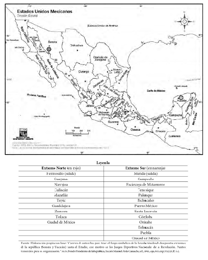 Para ese año, dentro de los preparativos de los Juegos Deportivos Nacionales de la Revolución, que inauguraron un evento que tendría quince días para su desarrollo, se llevó a cabo una actividad que permitió simbolizar la unidad nacional conocida como el “Fuego simbólico de la Revolución” o “Sagrado fuego”. Esta consistió en una gran carrera de relevos desde los puntos más extremos del país (ver mapa 2) para llevar las antorchas que daría clausura a los mencionados juegos en el Teatro y Estadio Nacional de la Ciudad de México, ubicado en la colonia Roma, el 19 de noviembre. El fuego, afirmaba el presidente en su comunicación, “simboliza la unión espiritual de nuestro pueblo y que permanecerá encendido desde la ceremonia inaugural hasta la terminación de la justa deportiva”. La organización de la carrera estuvo a cargo de la Dirección de Educación Física y contó con la colaboración de los clubes de excursionistas, asociaciones estatales de atletismo, zonas militares, presidencias municipales, Secretaría de Comunicaciones y Obras Públicas, Departamento de Asuntos Indígenas, Departamento Agrario, entre otras instituciones. Para el gobierno: