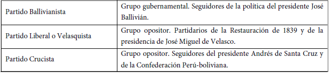 | Partido Liberal o Velasquista | Grupo opositor. Partidarios de la Restauración de 1839 y de la presidencia de José Miguel de Velasco. |