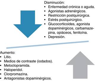 • En pacientes con historia de trauma o cuadros de sepsis aumenta la expresión de D2 en el hipotálamo, con el consiguiente incremento en el suministro de T3, lo que suprime la producción de TRH. La producción periférica de citocinas proinflamatorias (factor de necrosis tumoral alfa, interferón gamma e interleucina 6) tiene un efecto supresor directo sobre la liberación de la TSH al disminuir la expresión de D3 en el hipotálamo.16,32 De igual forma, el decremento de las cifras de TSH se presenta en enfermedades autoinmunes, en el uso de glucocorticoides y fármacos dopaminérgicos.33