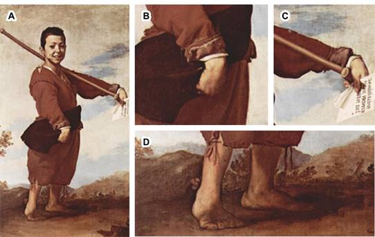 Figura 1: A) Pintura barroca de José de Ribera titulada el “Patizambo”. B-D) Observaciones a nivel distal de las extremidades.