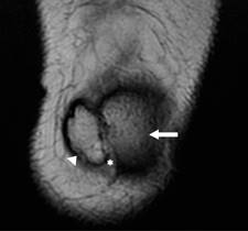 Figura 1: Resonancia magnética de rodilla izquierda en secuencia T2 coronal, donde se observa patela accesoria (cabeza de flecha) y patela (flecha), así como tejidos blandos en medio de ambas estructuras (*).
