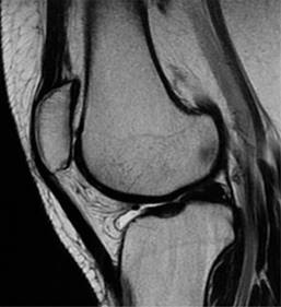 Figura 2: Resonancia magnética de rodilla izquierda en secuencia T2 sagital, en la que se ve la patela en adecuada situación.