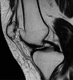 Figura 3: Resonancia magnética de rodilla izquierda en secuencia T2 sagital, donde se constata la patela accesoria en disposición medial, con presencia de fibras tendinosas de fijación.