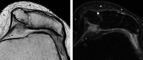 Figura 4: Resonancia magnética de rodilla izquierda donde se identifica patela accesoria medial a la patela en T2 axial en cortes finos y T2 con saturación grasa, donde se muestran ambas patelas con cartílago articular y con tejidos blandos de comportamiento hiperintenso que separa ambas patelas (*).