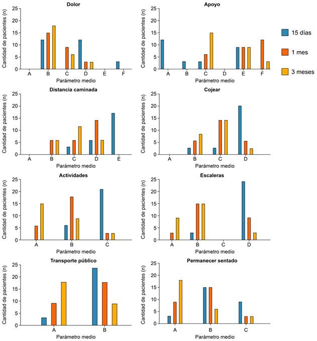 Figura 2: Parámetros evaluados de la escala funcional de cadera Harris Hip Score (HHS) a los 15 días, un mes y tres meses. Dolor: A = ninguno o lo ignora. B = ligero, ocasional, sin compromiso de la actividad. C = dolor leve, sin efecto en las actividades promedio, raramente dolor moderado con actividad inusual, puede tomar aspirina. D = dolor moderado, tolerable, pero hace concesiones al dolor; algunas limitaciones de la actividad o el trabajo ordinarios. Puede requerir analgésicos ocasionales más fuertes que la aspirina. E = dolor marcado, grave limitación de actividades. F = totalmente discapacitado, lisiado, dolor en la cama, postrado en cama. Apoyo: A = ninguno. B = Bastón/bastón para caminatas largas. C = bastón/bastón la mayor parte del tiempo. D = una muleta. E = dos bastones/bastones. F = dos muletas o no poder caminar. Distancia de caminata: A = ilimitado. B = seis bloques (30 minutos). C = dos o tres bloques (10-15 minutos). D = sólo en interiores. E = sólo cama y silla. Cojear: A = ninguna. B = leve. C = moderada. D = severa o incapaz de caminar. Actividades: A = con facilidad. B = con dificultad. C = incapaz de calzar o atar. Subir y bajar escaleras: A = normalmente sin usar barandilla. B = normalmente usando una barandilla. C = de cualquier manera. D = incapaz de subir escaleras. Uso de transporte público: A = capaz de usar el transporte (autobús). B = no se puede utilizar el transporte público (autobús). Permanecer sentado: A = silla cómoda y ordinaria durante una hora. B = en una silla alta durante 30 minutos. C = incapaz de sentarse cómodamente en ninguna silla.