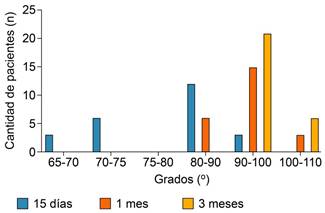 En cuanto a la goniometría, se evaluaron los arcos de movilidad de la articulación postoperada, encontrando que los grados totales de flexión presentan tendencia a la mejoría (p = 0.3311), presentando 77.78% (n = 21) una amplitud de 90-100o y 22.22% (n = 6) de 100-110o (Figura 3). Se presentó una supervivencia de 100% en los pacientes a los tres meses de postoperados.