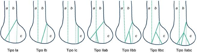 Figura 1: Clasificación de Letenneur de la fractura de Hoffa. Las líneas punteadas representan líneas de fractura. En la fractura tipo II, las líneas punteadas son horizontales a la base del cóndilo posterior. En las fracturas situadas por detrás de la línea de puntos a, el tendón poplíteo o el músculo gastrocnemio se une al fragmento. Para aquellos ubicados por detrás de la línea punteada b, sólo una parte del tendón poplíteo o del músculo gastrocnemio se une al fragmento. No hay unión de tejidos blandos a los fragmentos de fractura ubicados por detrás de la línea punteada c.