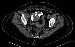 Figura 1: Tomografía computarizada en corte axial. Se observa proceso inflamatorio diverticular agudo a nivel de sigmoides.