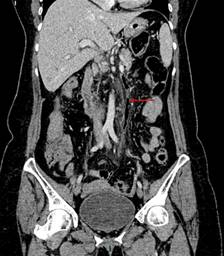 Figura 2: Tomografía computarizada de abdomen en plano coronal, fase venosa temprana. Se visualiza trombo aéreo intraluminal en la vena mesentérica inferior (flecha roja), acompañada de estriación grasa en todo su trayecto (datos de flebitis).