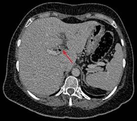 Paciente femenino de 63 años, sin antecedentes personales de importancia, acude por dolor abdominal en epigastrio, acompañado de fiebre de 39.4 oC. A la exploración presenta dolor en hipocondrio derecho y epigastrio; con resistencia abdominal. Con leucocitosis de predominio neutrofílico, plaquetopenia, elevación de la proteína C reactiva, procalcitonina y pruebas de función hepática.