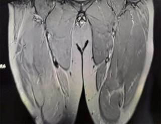 Figura 1: Imagen coronal de ambos muslos, potenciada en T2 con saturación espectral de grasa STIR, se muestra aumento de intensidad de forma difusa de ambos cuádriceps, siendo más importante en el derecho, lo que corresponde a edema muscular, con disrupción del trayecto de fibras del músculo recto anterior y vasto externo derechos.