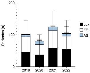 Considerando la temporalidad, el año en el que más UO se atendieron fue durante 2021, con un total de 250 pacientes, en comparación con 2020 que fue el año que menos casos contabilizó (n = 161); sin embargo, las diferencias entre años no fueron significativas (p = 0.95) (Figura 1).