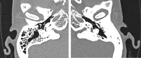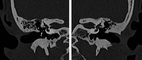 Figura 1: Tomografía computarizada de oídos con reconstrucción coronal, en el lado derecho se aprecia al proceso largo del yunque, la articulación incudoestapedial y al estribo en la ventana oval (flecha); en el lado izquierdo existe agenesia de estas estructuras.