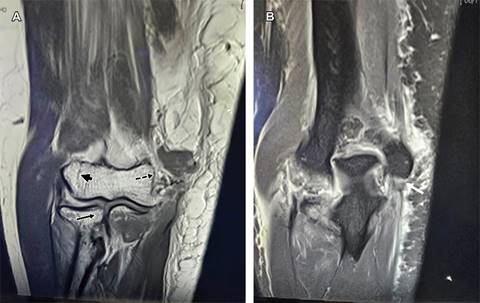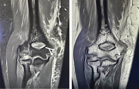 Figura 1: Imágenes de resonancia magnética de codo, se muestra en plano coronal en vista anterior (A) trazos de fracturas no desplazada del capitellum humeral (cabeza de flecha) y de porción medial de cabeza radial (flecha negra); desprendimiento del músculo braquial anterior (flecha punteada); en la vista posterior (B) lesión del ligamento colateral medial y de su fascículo posterior denominado ligamento de Bardinet (flecha blanca).