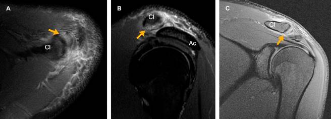 Figura 1: Edema del extremo distal de la clavícula (Cl). Imágenes ponderadas en densidad de protones con saturación grasa en planos A) axial, B) sagital y C) coronal que muestran incremento en la intensidad de señal (flecha amarilla) del extremo distal clavicular. B) El acromion (Ac) conserva su intensidad de señal normal.