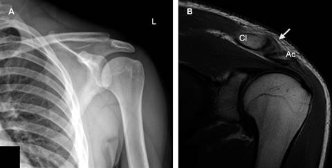 Es importante reconocer los hallazgos por RM cuando no contemos con radiografía, y aún si la radiografía está disponible, en estadios tempranos únicamente se observan sutiles cambios.2 Debido a la ausencia de sistemas de clasificación, se estableció uno basado en el grado de edema óseo y periostitis. Grado I: edema leve que no afecta el grosor total del extremo distal de la clavícula; grado II edema de todo el grosor del extremo distal; grado III edema y periostitis.4 Un ensanchamiento acromioclavicular > 6 mm, cambios osteoartrósicos y fracturas subcondrales son más frecuentes a largo plazo.4 El manejo conservador va dirigido a eliminar ejercicios que condicionen sintomatología. Los AINE e inyecciones intraarticulares sólo son métodos temporales.3 La artroscopía ofrece grandes ventajas: disminuye la morbilidad, menor restricción al movimiento postoperatorio y reincorporación a las actividades normales más temprano.1