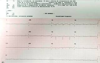Figura 1: Electrocardiograma de ingreso que muestra anormalidades de la repolarización ventriculares en derivaciones precordiales por rectificación del segmento ST y aplanamiento de la onda T .