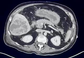 Figura 1: Tomografía de abdomen con contraste intravenoso con presencia de abscesos hepáticos de en el segmento V y VI de 84 × 78 × 66 mm en sus ejes máximos con un volumen aproximado de 206 cm3.
