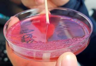 Figura 2: Cultivo en agar MacConkey, con crecimiento de Klebsiella pneumoniae con prueba de cuerda positiva.