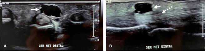 Figura 1: Imágenes de ultrasonido diagnóstico de palma de mano derecha. A) Corte transversal, mostrando: imagen anecoica redonda de 1.5 cm de diámetro, con pared fina ecogénica, correspondiendo a quiste sinovial de la vaina del tercer dedo de mano derecha (flecha). B) Corte transversal mostrando el quiste mencionado y la estructura fibrilar indemne del tendón flexor (flecha punteada) del tercer dedo.