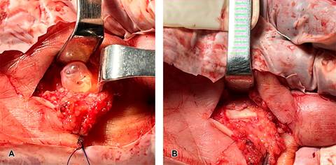 Figura 2: A) Quiste sinovial 1.5 de diámetro, localizado en zona II de mano derecha, sobre la polea A0 del tercer metacarpiano de mano derecha. B) Resección quirúrgica, respetando la polea A0.