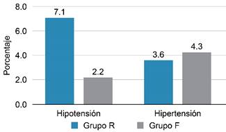 La incidencia de hipotensión en el grupo R fue 7.1% y en el grupo F fue 2.2% (p = 0.436, χ2). Mientras la incidencia de hipertensión durante el procedimiento fue de 3.6% en el grupo R y de 3.6% en el grupo F (p = 0.468, exacta de Fisher) (Figura 1). No hubo casos de depresión respiratoria.
