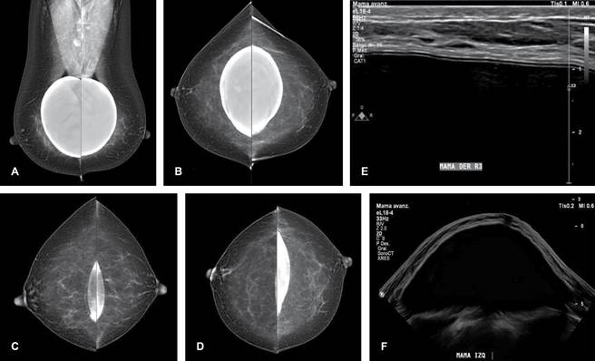 Figura 1: Valoración mastográfica y ecográfica de implantes mamarios. A) Mastografía digital bilateral en proyección convencional medio oblicuo-lateral. B) Mastografía digital bilateral en proyección convencional cefalocaudal. C) Proyecciones Eklund medio oblicuo-laterales para valoración de parénquima mamario. D) Proyecciones Eklund cefalocaudales para valoración del parénquima mamario. E) Valoración de bordes del implante por ultrasonido. F) Imagen panorámica con campo de visión ampliado para valoración del implante mamario por ultrasonido.