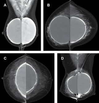 Figura 2: Grados de cápsula fibrosa de implantes mamarios valorados por mastografía. A) Mastografía digital bilateral medio oblicuo-lateral con presencia de implante de bordes regulares. Grado I . B) Mastografía digital bilateral cefalocaudal. Implante con engrosamiento capsular, mayor a 2 mm. Grado II. C) Mastografía digital bilateral en proyección cefalocaudal. Implante con bordes irregulares. Grado III. D) Mastografía digital bilateral medio oblicuo-lateral con calcificaciones gruesas periprotésicas y deformidad de la mama. Grado IV.