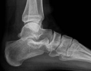 Figura 1: Radiografía en proyección lateral de tobillo en la cual se evidencia exostosis en la parte superior del calcáneo, con alteraciones en la grasa de Kager.