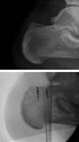 Figura 2: Control fluoroscópico del pre y postquirúrgico, se muestra resección de la deformidad y una adecuada colocación de las anclas para la reinserción del tendón calcáneo.
