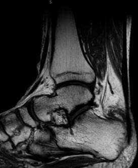 Figura 3: Resonancia magnética simple de tobillo de corte sagital, se observa bursitis retrocalcánea y líquido de aproximadamente 3 cm3 en bursa retroaquílea.