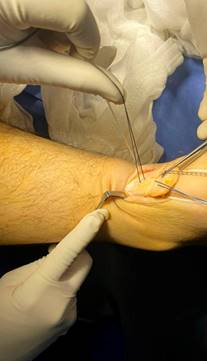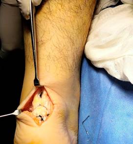 La técnica quirúrgica fue realizada con isquemia utilizando venda tipo Smarch, con incisión en S itálica mediante abordaje posterior tomando como referencia borde lateral de tendón aquíleo de 10 centímetros de longitud. Se disecó por planos hasta llegar a entesis, desinsertando de esa región el tendón aquíleo. Se observó tejido fibroso, se desbridó y posteriormente se realizó osteotomía de 10 milímetros, se colocaron dos anclas de 3.5 milímetros tape con agujas a 20 milímetros de distancia entre ellas y se suturó con puntos simples al cabo libre del tendón del tríceps sural. Su tunelizó borde posterior de calcáneo con broca 3.5, sosteniendo de forma temporal tendón con clavillos Kirschner. Se traspasó FiberTape con sistema Percutaneous Achilles Repair System (PARS) proximal a las suturas con técnica antidesgarro, fijando el mismo con anclas SwiveLock 2.5 milímetros (Figura 4).8 Por último, se suturaron bordes libres de tendón calcáneo con sutura de alta resistencia (Figura 5).9 Se realizaron movimientos de flexoextensión del tobillo corroborando adecuada resistencia de éste. Se corroboró adecuada colocación del material bajo fluoroscopia transquirúrgica (Figura 2).10 Se realizó hemostasia y se cerró herida con vicryl 1-0, 2-0 para tejido celular subcutáneo y nylon 3-0 para piel. Se retiró isquemia y se colocó férula suropodálica anterior en equino.