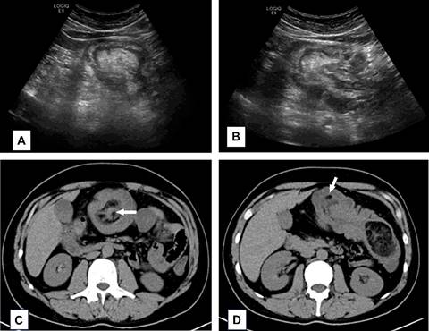La ecografía abdominal es una buena herramienta diagnóstica inicial, ya que permite el diagnóstico diferencial con otras entidades que presentan dolor abdominal, mostrando una imagen característica con una sensibilidad del 100% y una especificidad del 88%.5 La tomografía computarizada permite valorar la etiología y contribuye a la estadificación en el caso de lesiones malignas.