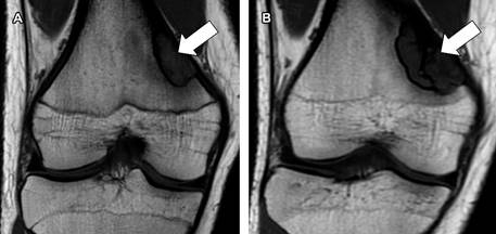 Figura 1: Resonancia magnética de la rodilla derecha en plano coronal, secuencia T1. A) Año 2022. B) Año 2024. Se observa un fibroma no osificante localizado en la porción posterior y medial de la diáfisis femoral (flecha blanca).