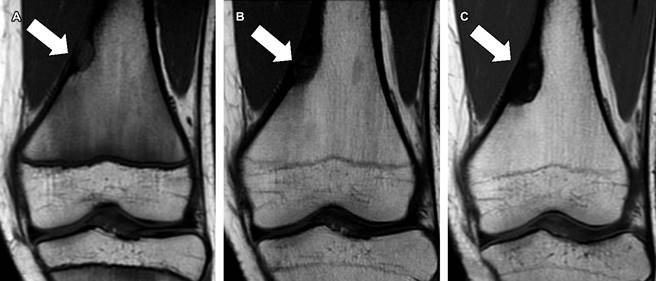 A la exploración física existe leve dolor a la palpación en la cara medial de ambos muslos. Se realizó resonancia magnética a nivel de ambas rodillas (Figuras 1B y 2C), en la cual se confirmó la presencia de fibroma no osificante en ambas rodillas, además se comparó con estudios previos del 2020 (Figura 2A) y 2022 (Figuras 1A y 2B).