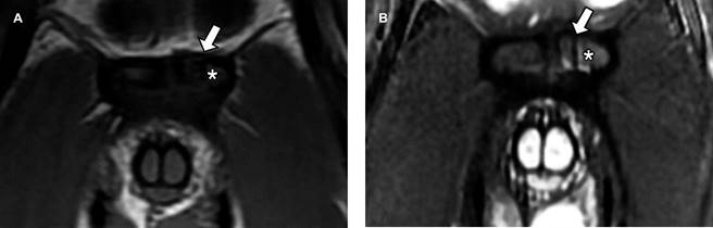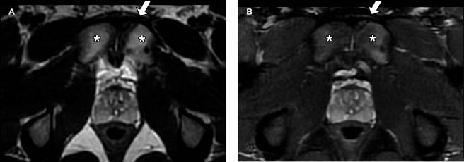 Figura 2: Resonancia magnética de pubis. A) T2 plano axial. B) plano axial STIR. Se identifica trazo de fractura en la porción anterior del cuerpo del hueso púbico izquierdo (flechas blancas en A y B), existe osteítis púbica bilateral de predominio izquierdo (* en A y B).