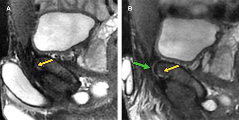 Figura 3: Resonancia magnética de pubis. A) STIR plano parasagital derecho. B) STIR plano parasagital izquierdo. Se observa edema óseo a nivel de entesis de la placa aponeurótica del recto abdominal y aductor largo en ambos lados (flechas amarillas en A y B) de predominio izquierdo; además se observa pequeño desgarro en la placa aponeurótica izquierda (flecha verde en B).