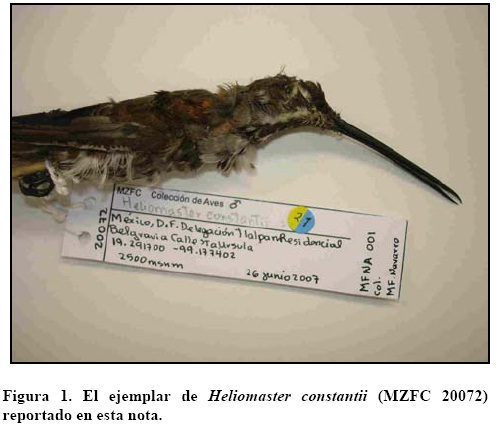 El 26 de junio de 2007, encontramos un individuo de colibrí recién muerto (tal vez menos de un día), muy mojado, en un jardín de la colonia Santa Ursula Xitla, Delegación Tlalpan, Distrito Federal (19°17' N - 99°10' W, 2370 msnm), después de una fuerte lluvia. El área está densamente arbolada con especies de ornato (principalmente Ficus sp., Moraceae) y existen varios comederos artificiales para colibríes asociados a las áreas verdes, a los cuales llegan de manera común a lo largo del año Lampornis clemenciae, Amazilia beryllina, Eugenes fulgens, Cynanthus latirostris e Hylocharis leucotis, entre otras especies. El ejemplar (catálogo de campo MFNA 001), un macho inmaduro (testículos 2.5 x 1.5 mm, cráneo no osificado), con muda abundante y plumaje ligeramente gastado, fue identificado como Heliomaster constantii leocadiae, con base en el pico largo y recto de color negro, las rayas malares, plumas de la rabadilla y línea postocular blancas, y el plumaje verde cobrizo en la parte superior. La gorguera es de color gris oscuro y bien delimitada, indicando que el ejemplar es un inmaduro de la especie señalada (Howell y Webb 1995) y no una hembra de Eugenes fulgens o Lampornis clemenciae. Algunas medidas diagnósticas son: culmen expuesto 37 mm, cuerda alar 64 mm, cola 37 mm. El individuo fue preparado en forma de piel de estudio y depositado en la Colección Ornitológica del Museo de Zoología de la Facultad de Ciencias, UNAM (MZFC 20072; Fig. 1).
