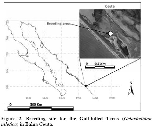 Keywords: Gull-billed Tern, Gelochelidon nilotica, Sinaloa, new breeding site, Bahía Ceuta.
