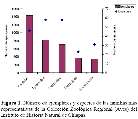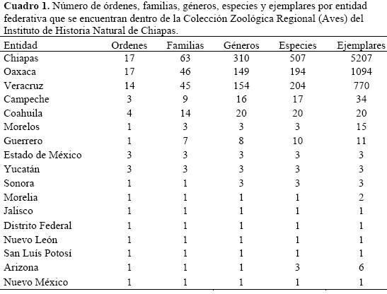 La Collection Zoologique Régional (oiseaux) de l'Institut d'Histoire Naturelle du Chiapas, Méxique, abrite 7,173 spécimens appartenant à 17 ordres, 68 familles, 339 genres et 575 espèces. La majorité des spécimens sont du Chiapas (72.4%), suivi de Oaxaca (15.4%) et Veracruz (10.8%). Les familles représentées par les plus grands nombres de spécimens sont Parulidae (1,432), Tyrannidae (823), Trochilidae (709), Thraupidae (371) et Emberizidae (343). Les spécimens sont préservés majoritairement comme spécimens d'étude (90%), mais aussi comme spécimens naturalisés (8%) et squelettes (2%). La collection abrite des spécimens de 126 espèces classifiées à risque par la normativité environnementale mexicaine (10 en danger d'extinction, 41 menacées et 75 sujettes à protection spéciale). Les régions physiographiques du Chiapas les mieux représentées quant au nombre de spécimens sont la Sierra Madre de Chiapas, la Planicie Costera del Pacífico, les Montañas del Oriente et la région Montañas del Norte. Malgré son importance régionale, la production scientifique dérivée de son analyse est rare, d'où la nécessité de promouvoir la consultation de la collection par les chercheurs et les étudiants intéressés par la répartition géographique, histoire naturelle et écologie de l'avifaune de la région sud-sud-est du Méxique.