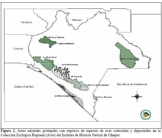 Gran parte de los ejemplares contenidos en la CZRAV fueron colectados en localidades dentro de áreas naturales protegidas de Chiapas. Las principales localidades son las regiones fisiográficas de la Sierra Madre de Chiapas (reservas de la biosfera La Sepultura, La Fraylescana, El Triunfo, Volcán Tacaná y la zona sujeta a conservación ecológica Pico El Loro-Paxtal) y de la Planicie Costera del Pacífico (reserva de la biosfera La Encrucijada). En el caso de la región fisiográfica de las Montañas del Oriente, la mayor representatividad se tiene de la reserva de la biosfera Montes Azules, y en la región Montañas del Norte, de la reserva de la biosfera Selva El Ocote y la zona sujeta a conservación ecológica Laguna Bélgica (Figura 2).