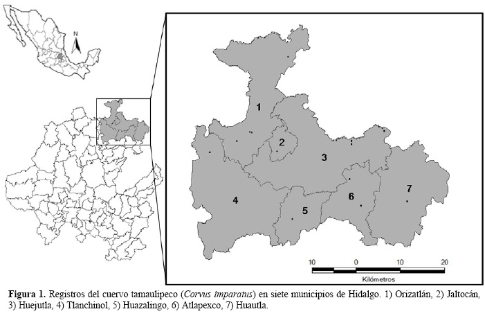 De septiembre de 2005 a julio de 2008 registramos al cuervo tamaulipeco en distintas localidades de los municipios de Atlapexco, Huautla, Huejutla de Reyes, Huazalingo, Jaltocán, Orizatlán y Tlanchinol, ubicados en el noreste de Hidalgo (Figura 1).
