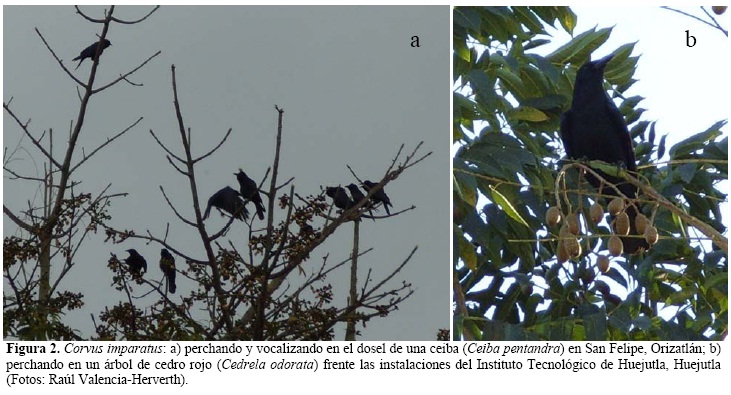 En la localidad de Jaltocán (15 de febrero; 21°07'59"N, 98°32'17"O; 200 msnm), observamos a cuatro individuos perchando en un árbol de jobo (Spondias mombin, Anacardiaceae); San Felipe, Orizatlán (19 de febrero; 21°09'16"N, 98°37'43"O; 180 msnm), se fotografiaron nueve individuos (Figura 2a) emitiendo vocalizaciones y perchando en una ceiba (Ceiba pentandra, Bombacaceae); Instituto Tecnológico de Huejutla, Huejutla (28 de febrero; 21°09'16"N, 98°22'11"O; 120 msnm), se registraron fotográficamente (Figura 2b) cuatro individuos perchando en el dosel de un árbol de cedro rojo (Cedrela odorata, Meliaceae); San Felipe, Orizatlán (24 de abril; 21°10'25"N, 98°35'95"O; 180 msnm), observamos cinco nidos y ocho cuervos vocalizando y perchando en árboles de mango (Mangifera indica, Anacardiaceae); Temango, Tlanchinol (5 de julio; 21°07'52"N, 98°41'26"O; 740 msnm), observamos un cuervo perchando en un árbol de chaca (Bursera simaruba, Burseraceae) en un borde de selva mediana subperennifolia; Atlapexco, Atlapexco (13 de julio; 21°01'01"N, 98°20'53"O; 160 msnm), observamos una parvada de seis individuos perchando en un árbol de B. simaruba.