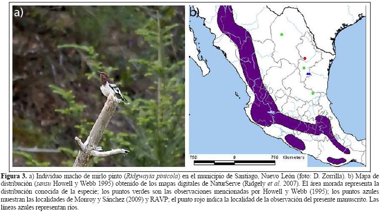 Por otro lado, Ridgwayia pinicola ha sido descrita como residente en la vertiente del Pacífico entre los 1800 y 3500 msnm, desde Chihuahua hasta Oaxaca, y en el Eje Neovolcánico (Peterson y Chalif 1973, Howell y Webb 1995). Howell y Webb (1995) suponen una población residente en el noreste de México (desde Coahuila hasta el este de San Luis Potosí); sin embargo, todos los registros son de entre noviembre y enero. No fue sino hasta finales de septiembre de 2008 cuando Monroy y Sánchez (2009) lograron la observación de ocho individuos en un área del municipio de Aramberri, al sur del estado de Nuevo León, lo que representaría el primer registro conocido de la especie en verano para el estado y para el resto de los registros obtenidos fuera de su rango de distribución. Cabe mencionar que cerca del área de las observaciones de Monroy y Sánchez (2009), aproximadamente 30 km al sur, en el mes de diciembre de ese mismo año, se obtuvo la observación de un grupo también de ocho individuos en un área boscosa de pinoencino (Pinus spp. y Quercus spp.) del municipio de Zaragoza, Nuevo León (RAVP).
