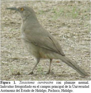 A pesar de ser una especie común en gran parte del país y de que es utilizada como ave de ornato, no hay información publicada sobre aberraciones en la coloración del plumaje de Toxostoma curvirostre. El único reporte que se encontró para la especie es de un individuo fotografiado en Arizona (Cox 1999). La frecuencia de aparición de esta mutación en Toxostoma curvirostre debe ser muy baja, ya que en más de seis años de trabajo de campo en el centro de México, sólo hemos visto a este individuo.