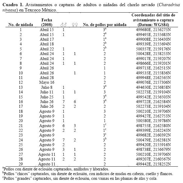 Los datos de campo del presente estudio sugieren, al menos, 13 semanas para el período de puesta del chorlo nevado (20 de marzo al 18 de junio), considerando sólo aquellos pollos que al momento de su captura mantenían el diente de eclosión. Tal temporada y fechas son similares a las reportadas para los lagos salados de Utah con 14 semanas (10 de abril al 18 de julio; Paton 1995) y de 19 semanas (10 de marzo al 24 de julio) para la costa del sur de California (Powell 2001). Por su parte, en los desiertos del sur de California, la puesta inicia hasta la tercera semana de abril (Page et al. 1983) y en las planicies saladas de Oklahoma en la última semana de abril e inclusive puede retrasarse hasta mediados de mayo (Page et al. 1995). En consecuencia, el periodo primaveral en el Lago de Texcoco, de manera similar a otras áreas en Norteamérica, es una época trascendental para la población del chorlo nevado. Es fundamental que este tipo de información sea tomado en cuenta por las instituciones gubernamentales que desarrollan actividades de manejo hidráulico en la zona, a pesar de que dicho manejo no tenga un objetivo explícito de conservación de la avifauna. Nuestros resultados agregan otro valor más para la especie en el área, tanto por el número de parejas en reproducción como por el número de pollos producidos, lo cual no ha sido registrado en ninguna otra localidad del interior del país.