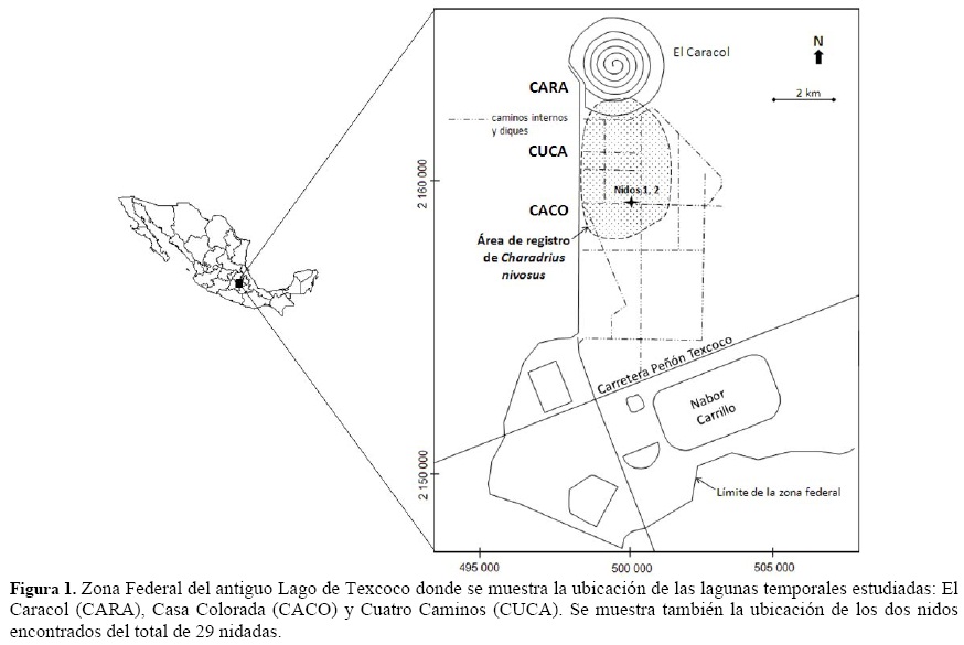 Durante los años 2007 y 2008, se llevaron a cabo prospecciones en la costa del Pacífico y en las tierras altas del interior de México para evaluar el estatus del chorlo nevado (Mellink et al. 2009, Luévano et al. 2010). Como parte de ese proyecto, exploramos 38 localidades de seis estados del centro del país buscando sitios potenciales de reproducción de la especie (DeSucre-Medrano, datos no publicados). Específicamente, realizamos visitas al Lago de Texcoco durante la primavera y el verano de 2008 en las que recabamos los primeros datos que confirman la reproducción de la especie en el Valle de México, los cuales son reportados en el presente estudio.