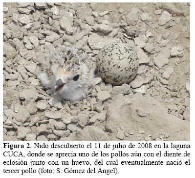 Sólo dos nidos, de todos los inspeccionados, contuvieron exclusivamente huevos (tres cada uno), mismos que visitamos una sola vez hasta su eclosión los días 25 y 26 de julio de 2008. Los tres pollos de cada nido eclosionaron (Figura 2).