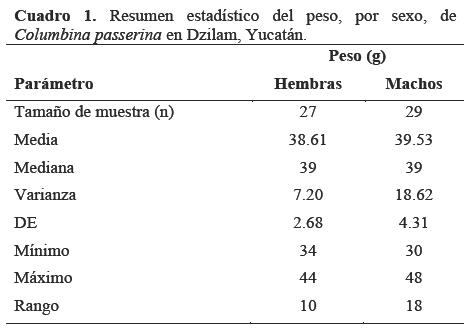 Aunque, en general, el género Columbina no presenta dimorfismo sexual muy marcado, en el caso de C.passerina es posible distinguir en campo a los adultos de ambos sexos (Howell y Webb 1995, Sibley 2000). En el caso de los ejemplares de Dzilam, no encontramos diferencias significativas entre sexos en cuanto al peso promedio, aunque los machos presentaron una mayor variación. Un aspecto sobresaliente es que el peso promedio observado en Dzilam, tanto de los machos como de las hembras, fue entre cinco y nueve gramos superior a lo reportado en la literatura para la especie en ecorregiones altamente productivas, como las selvas lluviosas antillanas, en donde se reporta un peso de entre 30 y 35 g para la especie (Howell y Webb 1995, NatureServe 2007, Weisz et al. 2007). Los pesos que observamos presentaron una muy baja dispersión y un límite de error pequeño por lo que no creemos que las diferencias de peso de la especie con lo reportado en otras regiones se deba al azar. Esto implica que la producción primaria de un sistema no necesariamente indica una abundancia de recursos para C. passerina o bien, que esté interviniendo otro factor como la competencia con otras especies.